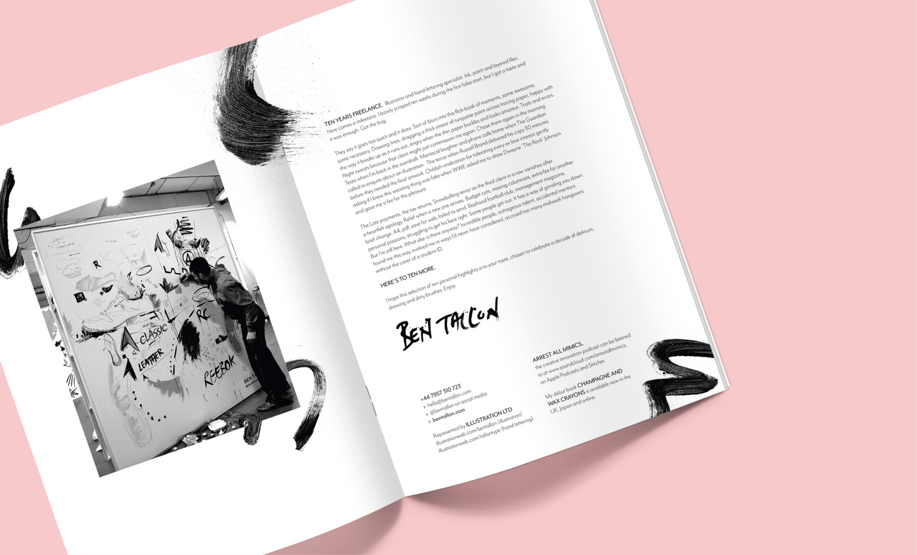 Promotional brochure design for illustrator Ben Tallon, celebrating his 10 year anniversary with 10 projects.